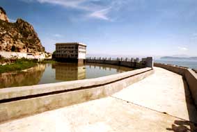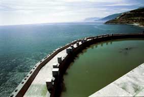Damm, dessen Einzelteile als Caissons in Piräus gefertigt wurden,