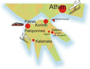 abbiegen. Nach 400 Metern rechts auf die Autobahn Richtung “Patras, Tripoli” fahren. Weiter: siehe oben Anreise mit