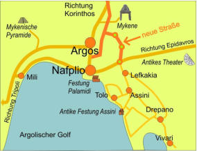 Mykene und Nafplio, dort abbiegen auf eine neue Straße. Achtung, dort oft Radarkontrollen! Diese