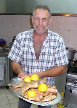 nicht so gern Fische essen, schon wegen der Gräten... Wer übrigens keinen Fisch isst, dem besorgt Aris auch gern von nebenan ein Kotelett - aus der Taverne seines Bruders Mimis... |
