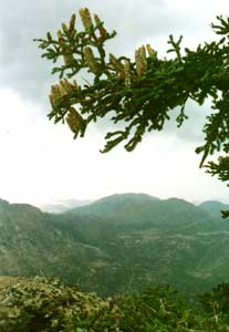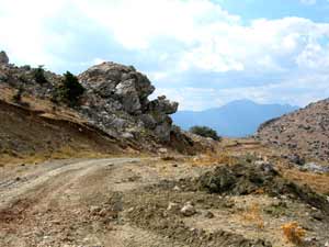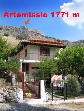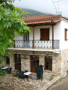 | Hier (Bild links) befindet sich die Taverne "Artemissio". Von Kariá aus geht die Fahrt in die Berge. Die Straße ist auf dem ersten, dem steilsten Abschnitt glücklicherweise asphaltiert. Ab etwa 900 Metern Höhe grüßen die ersten Tannenbäume. Die Straße ist normalerweise für Pkws befahrbar, aber auf keinen Fall bei Regen oder nach starken Regenfällen, weil dann unweigerlich an einigen etwas nassen Stellen das Steckenbleiben droht! Allradfahrzeuge ausgenommen. | |||||||||