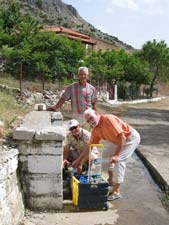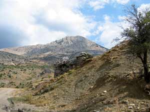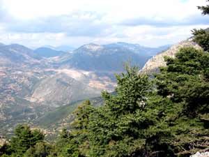 | Immer neue, atemberaubende Aussichten bieten sich auf der abwechslungsreichen Fahrt. Oben links der Artemissio-Gipfel, mit 1771 m der höchste Berg der Argolis. Rechtes Bild: Blick nach Norden - im Hintergrund die Autobahn Korinth-Tripoli. Am Brunnen von Brakazáki in 1150 m Höhe kann man herrliches Quellwasser tanken - es ist garantiert sauber! Leute von hier meinen, es sei das beste Wasser weit und breit. | |||||||||