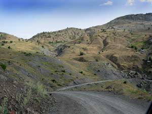 | Weiter geht die Fahrt nach unten, durch eine ursprüngliche Landschaft. Leider sind die Berge nicht (mehr) bewaldet, so dass kaum etwas die Bodenerosion stoppen kann. Das Bild rechts zeigt das ganz deutlich. Aber vielleicht gibt es ja irgendwann einmal einen Versuch zur Aufforstung - Wasser ist jedenfalls genug da, aber die Ziegenhirten müssten dann schon mitspielen.... | |||||||||