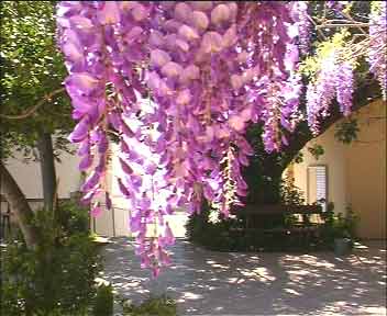 Rund 50 Meter lang ist das "Kirchenschiff" der Höhlenkirche von Kefalari (Bild links). Freischwebend ist dieser Felsblock im rechten Bild. Geschäftstüchtige bayrische Manager hätten hier natürlich längst eine Riesenbierkneipe mit Rittersaal eingerichtet. Die Griechen haben sich aber für eine Kirche entschieden, was man akzeptieren muss, aber ein bisschen schade ist es schon, zumal das Land wahrlich nicht an Kirchenmangel leidet. Denkbar wäre ja auch eine Kombination aus beidem, womit sicherlich beide Unternehmen Kunden hätten, aber wie gesagt, die Entscheidung der Bürger des Landes muss man einfach hinnehmen... Prachtvoll im Frühling der riesige Blauregen und daneben eine ebensogroße Bougainvillea. | |