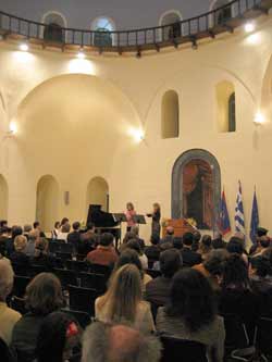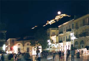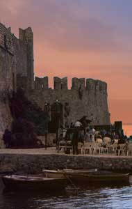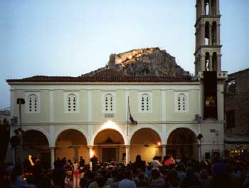 Bourtzi. During the Music Festival of Nafplio there is always also a concert in front of the Saint Georges church (right) and since 2004 also again on the fortress Bourtzi (left). |