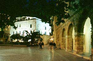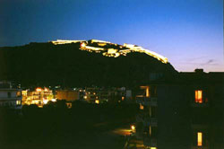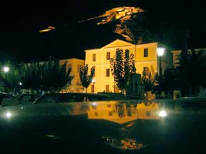 Links das Rathaus der Stadt, darüber die nachts illuminierte Festung Palamidi Foto rechts: die Töpferei von Takis, der nicht einzige Handwerker in der Altstadt ist. Photo left: the Town Hall of Nafplio with the Palamidi fortress which is illuminated by night. Photo right: The pottery of Takis who is not alone as craftsman in the historic town. |
