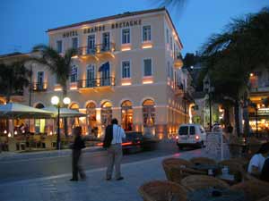 die Zweigstelle der Nationalgalerie, rechts das Hotel Grand Bretagne. Many old houses had been restored in the last years. Left the Nafplio branch of the National Gallery, right the Hotel "Grand Bretagne" |