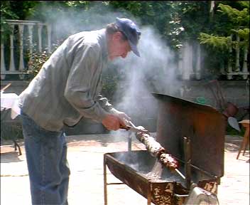 Grill brutzelt das Lamm, auf dem anderen das Kokoretsi, eine