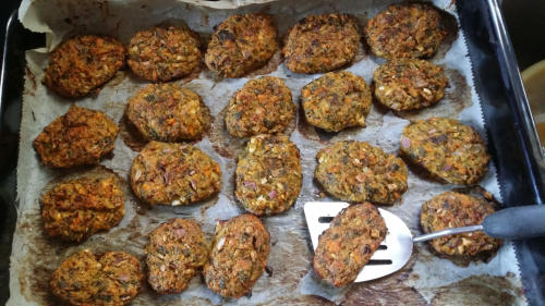 Aus der Masse die Buletten formen und auf das Backpapier auf dem Blech verteilen.