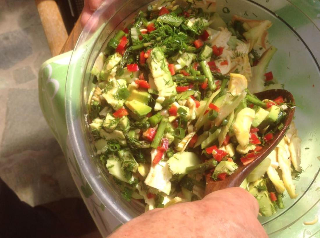 Zutaten für vier Personen: 2 bis 3 Artischocken,1 reife Avocado,1 rote Paprikaschote.wenn vorhanden, zwei Hände voll frische grüne Erbsen,2 Knoblauchzehen,frischer Dill, evtl. KorianderPfeffer, Salz,Gut macht sich auch ein wenig süße Chilli-Soße  zwei bis drei Zitronen