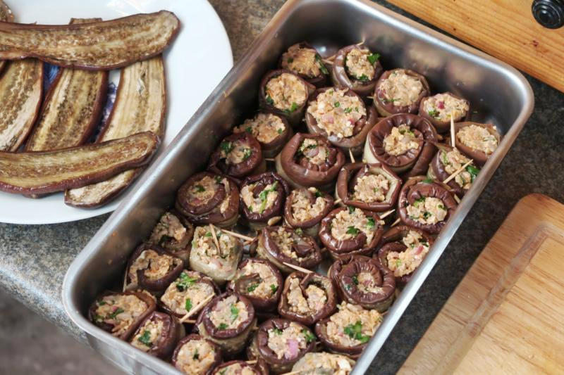 Die fertigen Auberginenröllchen in eine Form mit der Schnittfläche nach unten aufrecht