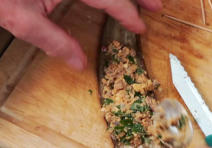Auf die erkalteten Auberginenscheiben die Füllmasse auftragen - ein gehäufter Teelöffel je