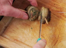 Scheibe - und die Scheiben rollen. Jeweils außen mit je einem Zahnstocker die Röllchen
