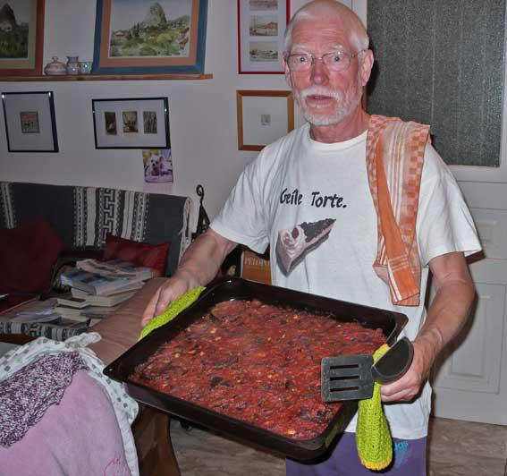Fruchtfleich etwas herausgenommen und durch die vorgegarte Füllmasse ersetzt. Man kann in die Form zwischen die Auberginen