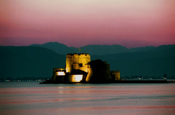 | Die Festung Bourtzi vor dem Hafen von Nafplio. Hier - so sagt die Überlieferung - waltete der Henker seines Amtes.. Heute streiten sich die Ämter, wem die Bourtzi gehört. Bis vor etwa 10 Jahren gab es dort ein nettes Café, heute kann man zwar noch per Boot hinüber fahren, muss aber seinen Kaffee selbst mit nehmen. | ||||