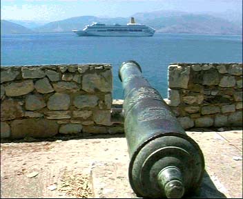| Große Kreuzfahrtschiffe müssen vor Nafplio auf Reede liegen, weil der Hafen zu flach ist. Ein Schelm, wer bei diesem Fotos Arges denkt und meint, Touristen seien hier nicht willkommen.... | ||||