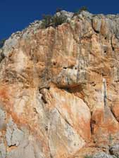 Ziegenspuren. Kurz vor dem Gipfel kommt diese gelblich-braune Felswand