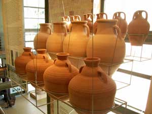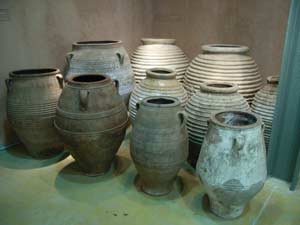 Seit Jahrtausenden wird Öl in Keramikbehältern aufbewahrt. Antike Muster links - etwas modernere Gefäße rechts. Erste schriftliche Überlieferungen über die Olive und ihr Öl stammen übrigens aus dem 14. Jh. v. u. Z. und wurden im Palast von Knossos auf Kreta gefunden. |