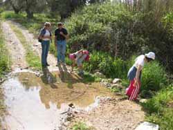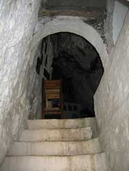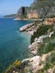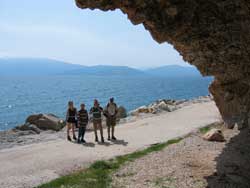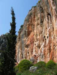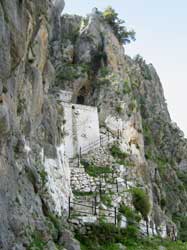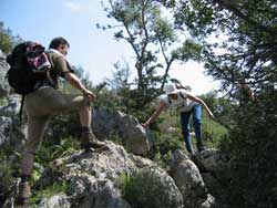 500 Meter abwärts gehen, am tiefsten Punkt rechts abbiegen, den Weg bergauf. So ziemlich an der höchsten Stelle nach links durch einen Olivenhain wandern. Dann geht der Weg abwärts durch ein Bachbett. Unbedingt lange Hosen tragen! Man sollte die Tour mit nicht weniger als drei Leuten gehen, um Hilfestellung geben zu können. | ||