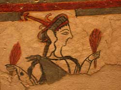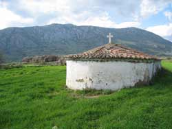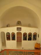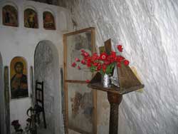 Ursprüngliche Malereien fielen leider - wie bei vielen alten Kirchen späteren "Renovierungen" zum Opfer. Interessant ist die Gestaltung der Apsis hinter dem Altarraum, die nicht wie bei den meisten Kirchen nur eine kleine abgesetzte Wölbung hat, sondern über die gesamte Breite der Kirche geht. Nicht weit von hier gibt es eine weitere Entdeckung: ein mykenisches Kuppelgrab. | ![]() |