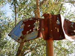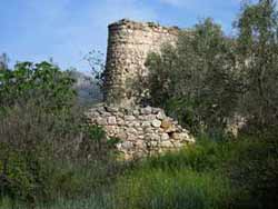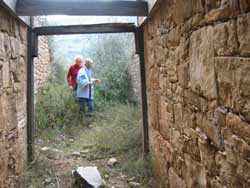 | An der Asphaltstraße steht zwar ein Wegweiser dorthin, aber, um das Grab zu finden, braucht es schon ein wenig Gespür, denn es ist alles ziemlich zugewachsen. Das Grab befindet sich mitten in einem Olivenhain. Der Eingang lässt ahnen, dass es wohl dereinst für die sterblichen Überreste einer hochgestellten Persönlichkeit errichtet wurde. Die Kuppel ist oben offen. | ||||